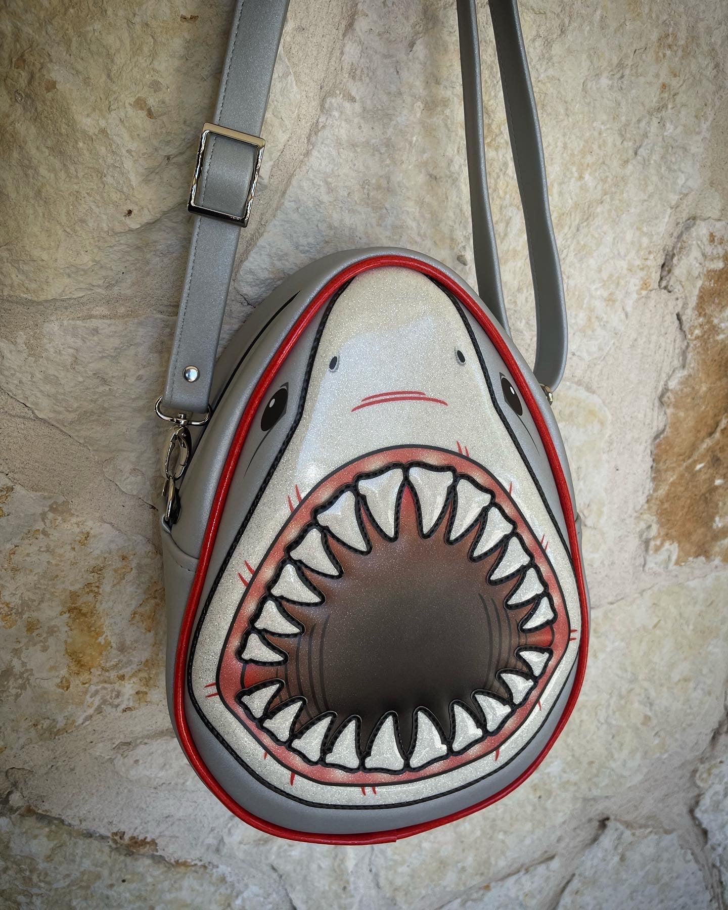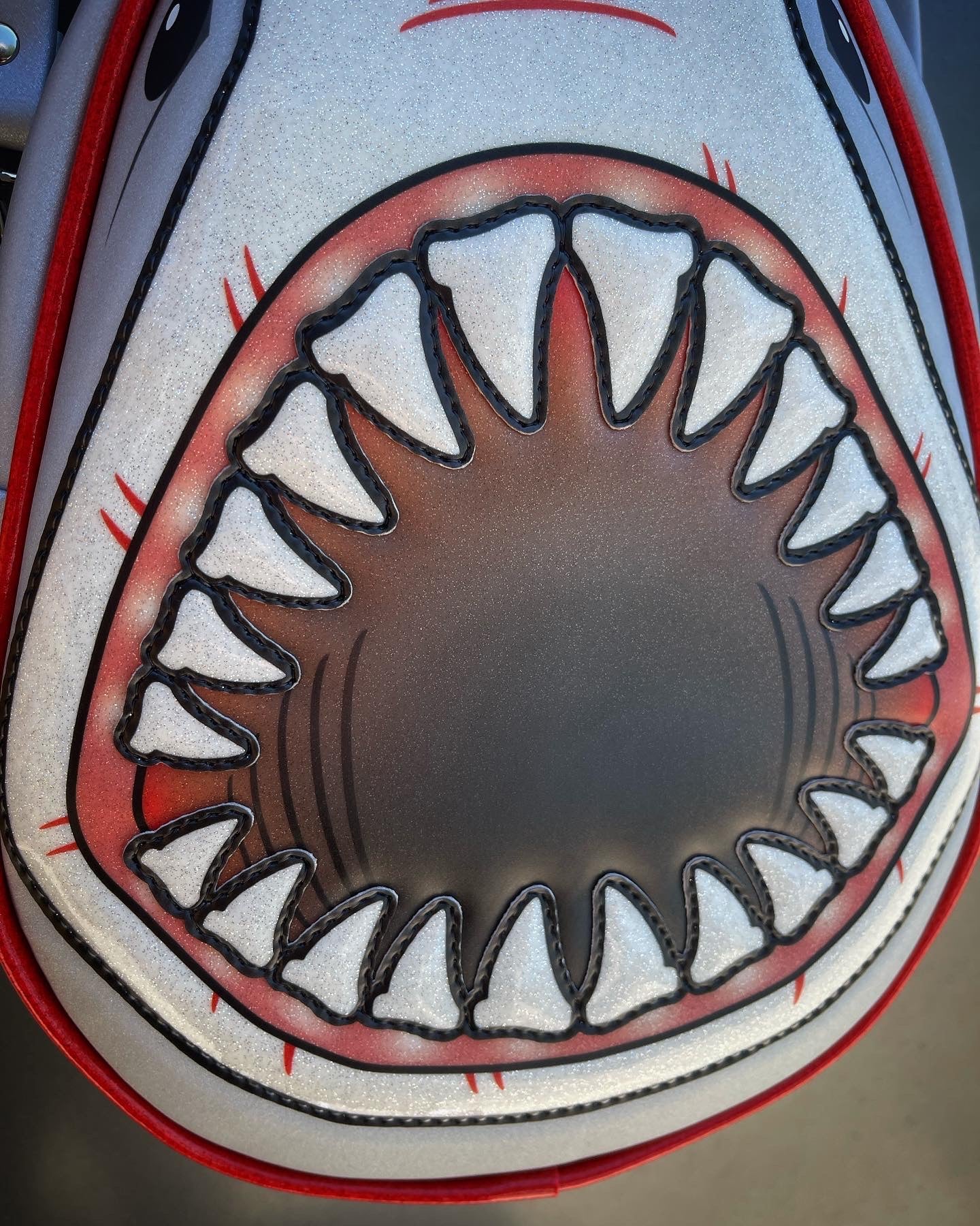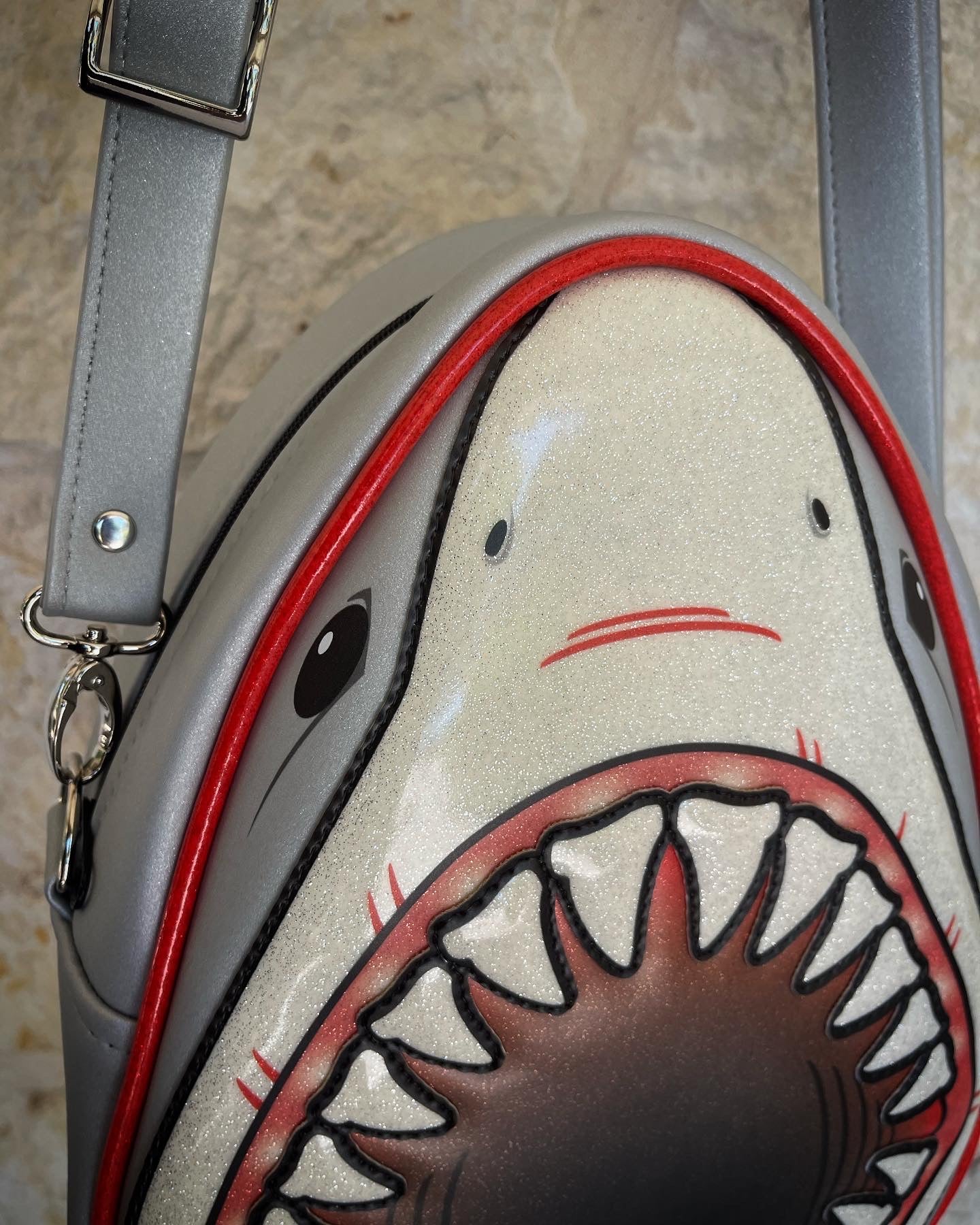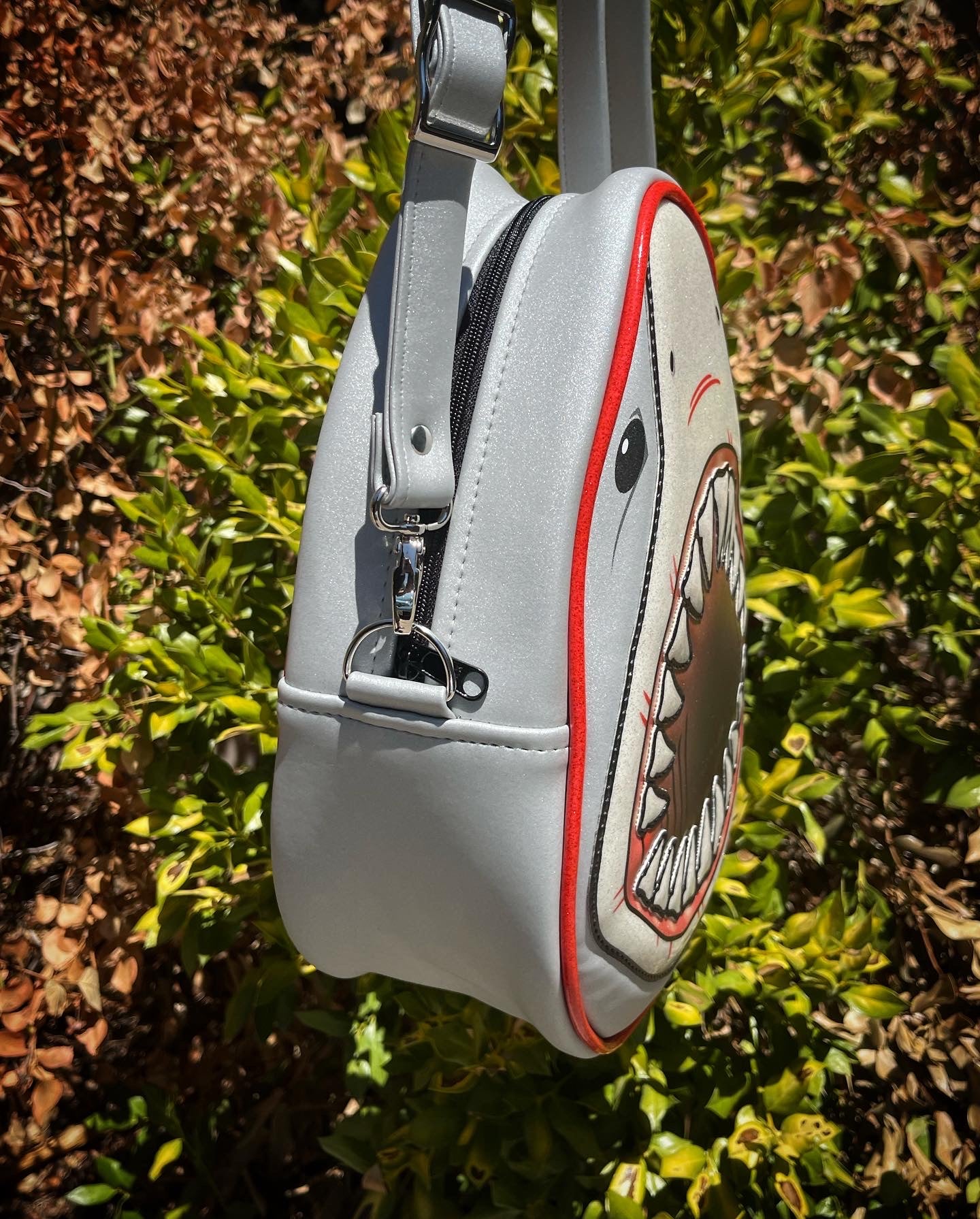 We created this shark mouth bag using a variety of techniques to achieve the details. We used printed elements, and cut and sewn applique work to make the details of the shark mouth pop. We used our professional Roland UV printer to apply printed details to the glitter vinyl. The base of this custom shark mouth bag is silver shimmer vinyl. Our shimmer vinyl is less shiny and less glittery than our normal glitter vinyl. A layer of white glitter, printed with details, was added and sewn on top of the silver. The teeth were cut, printed, and sewn on top of the of the mouth area. These measure about 13"x10"x5". There is one inside slip pocket and one outside slip pocket. Includes an adjustable silver glitter strap.