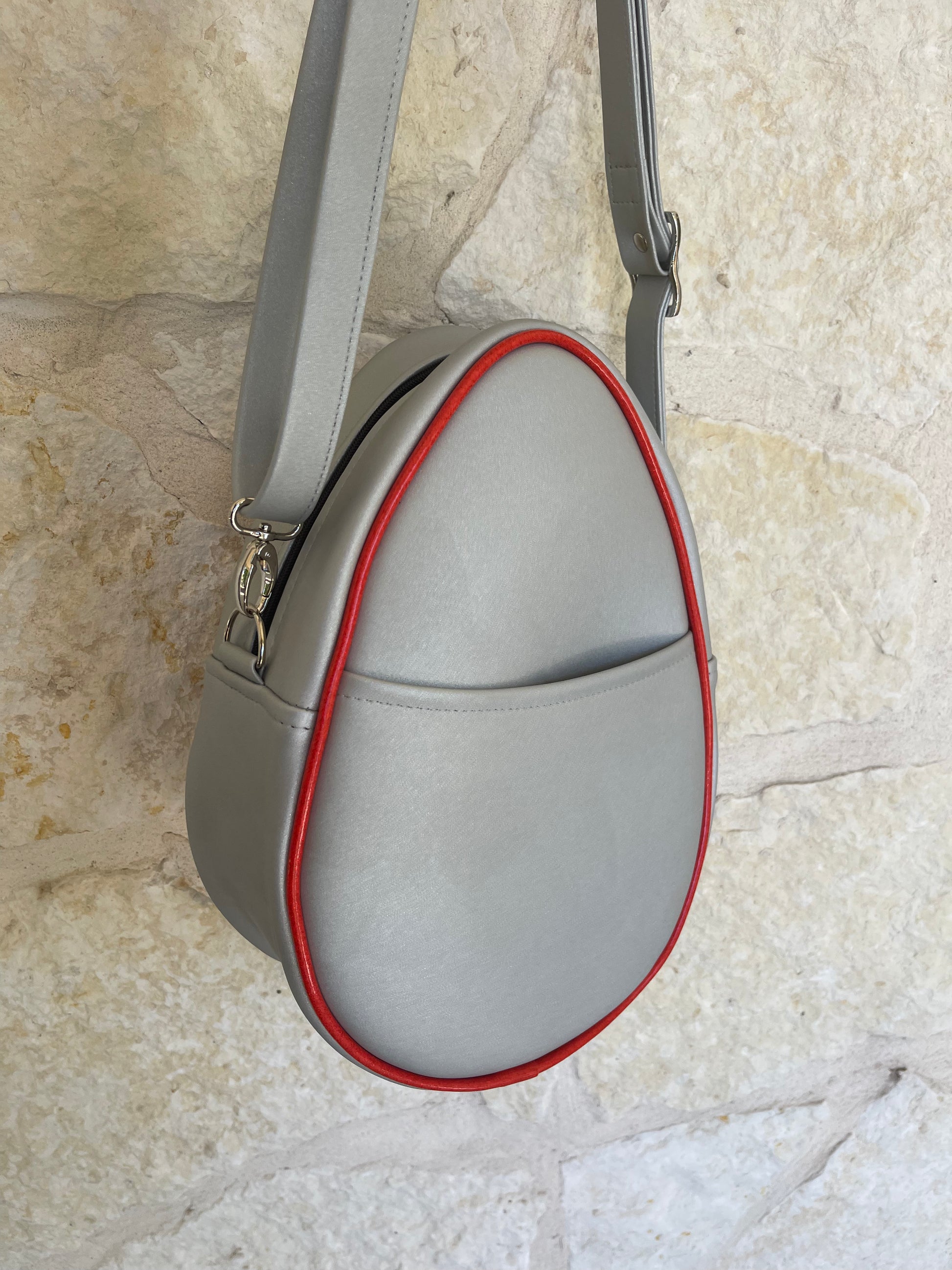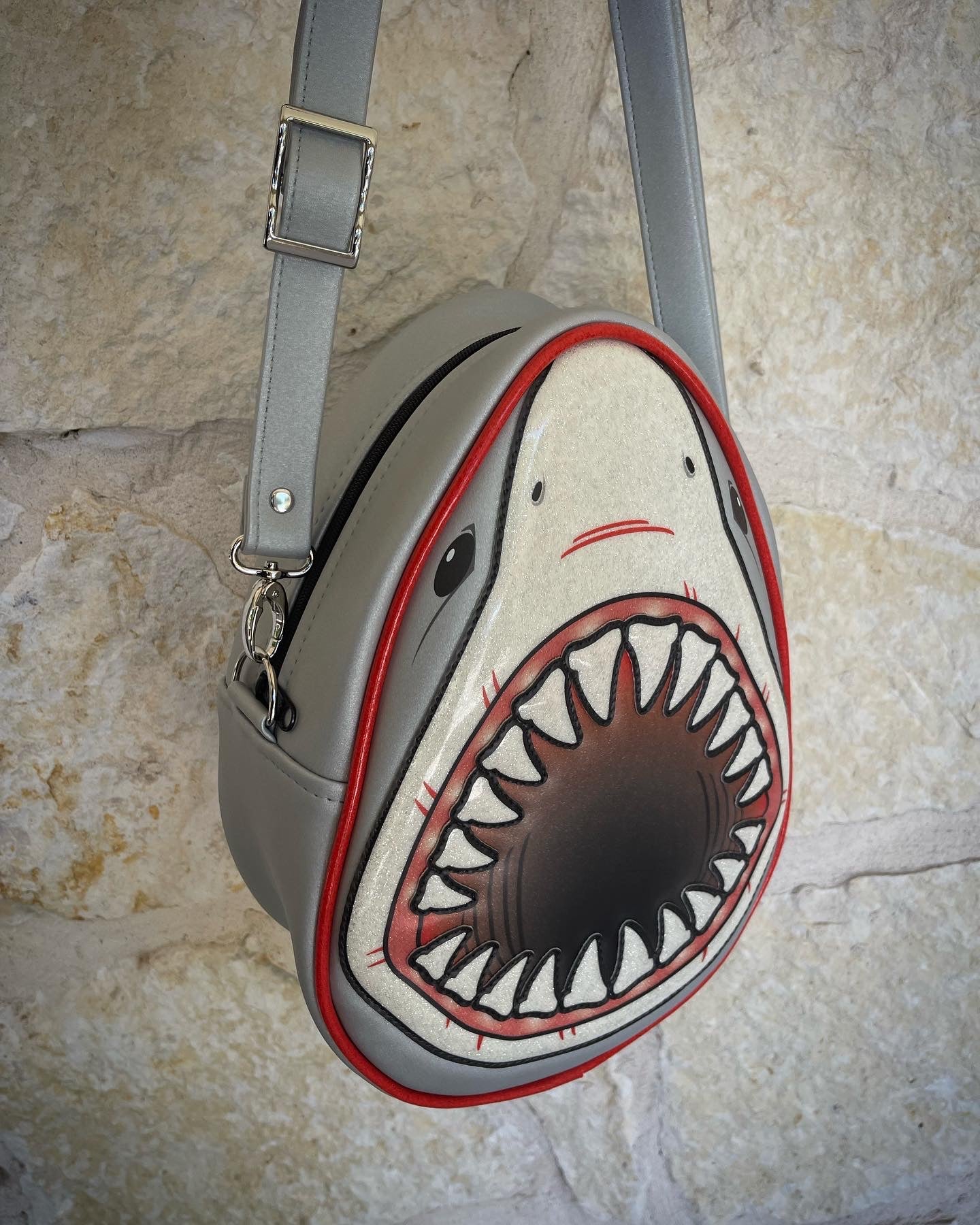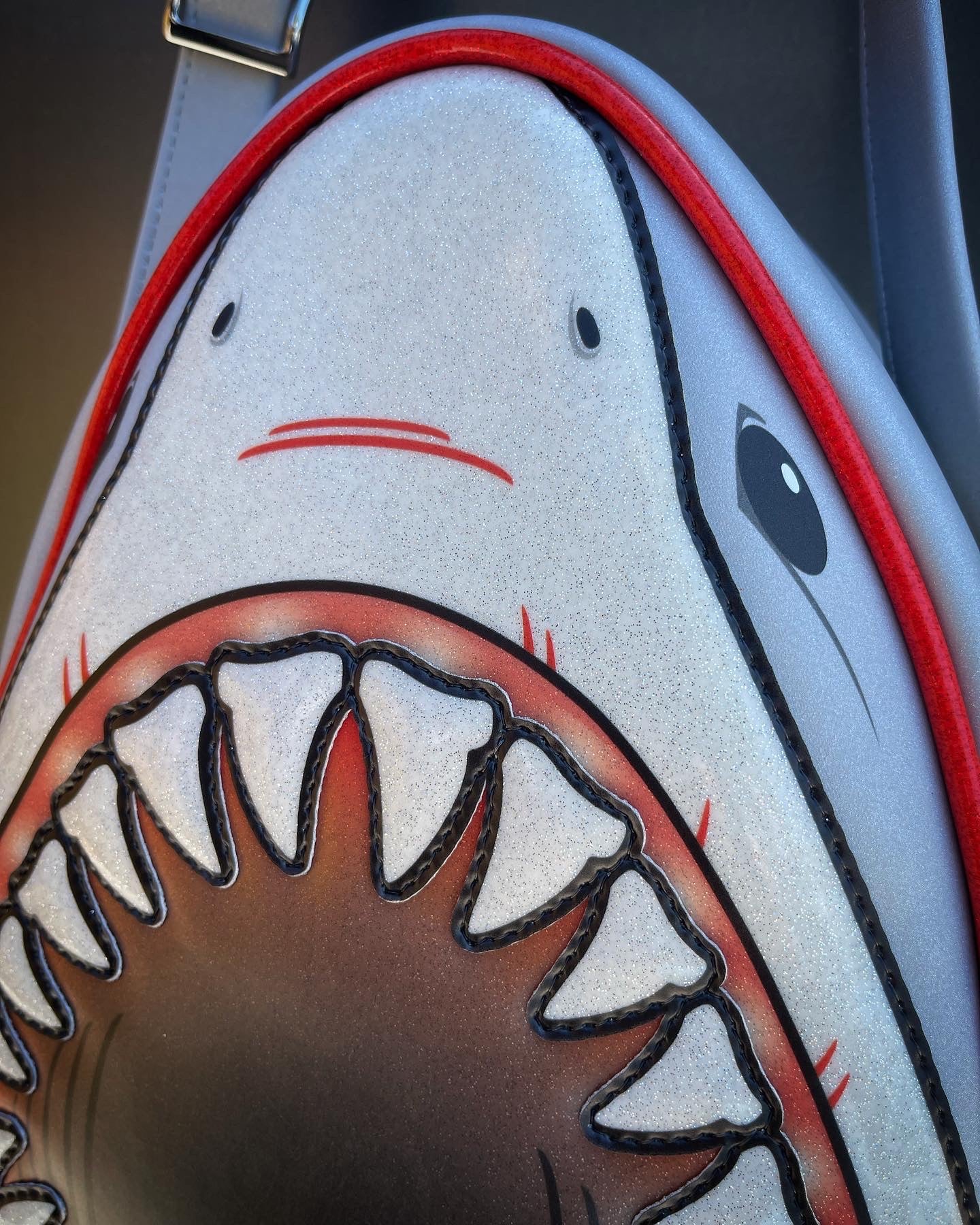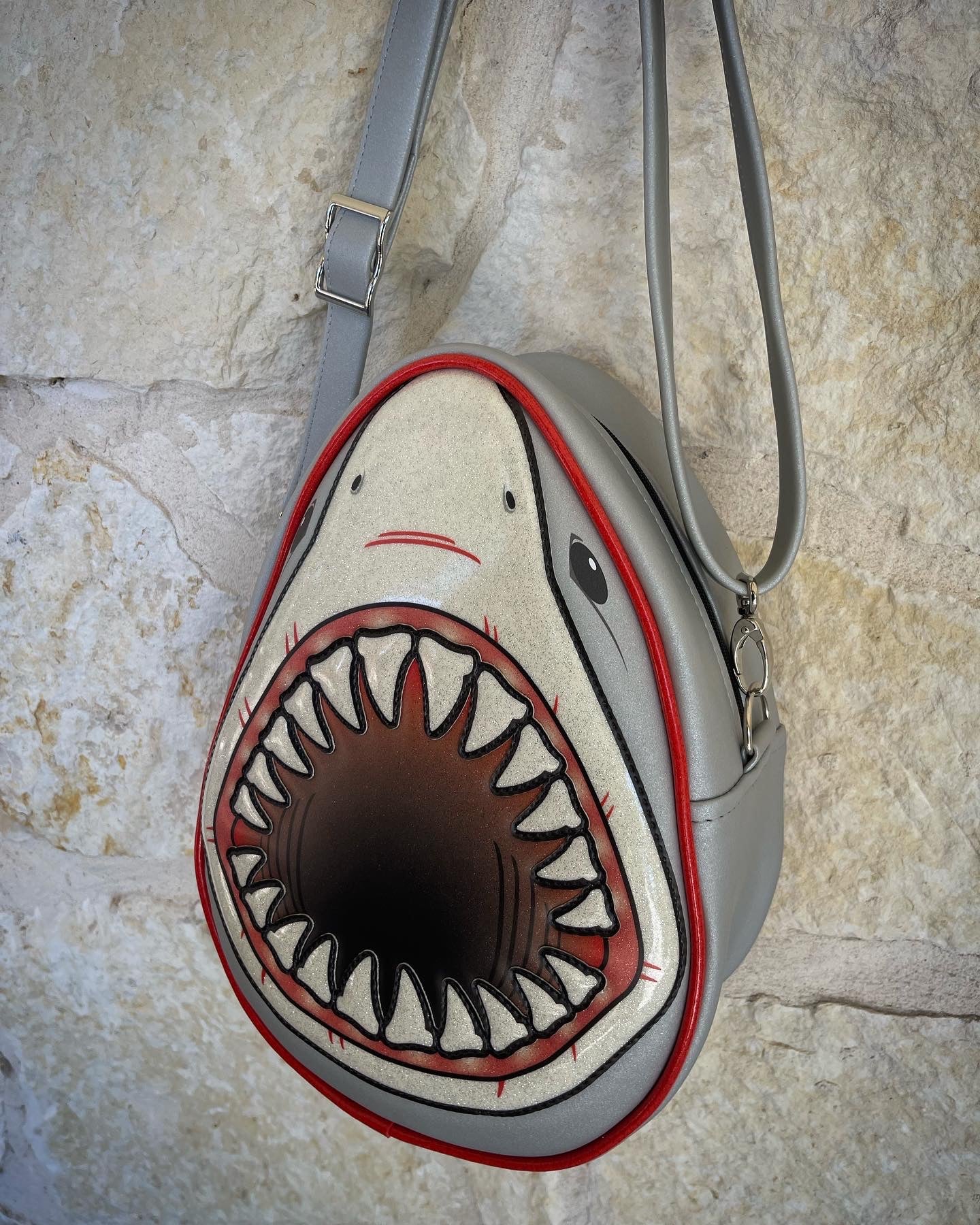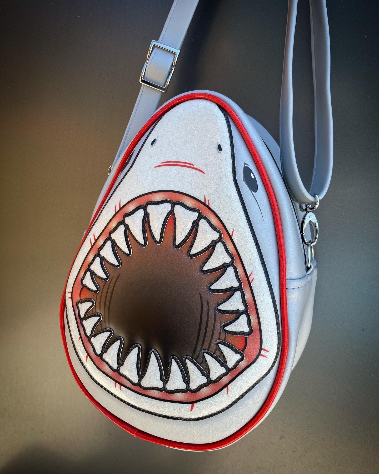 We created this shark mouth bag using a variety of techniques to achieve the details. We used printed elements, and cut and sewn applique work to make the details of the shark mouth pop. We used our professional Roland UV printer to apply printed details to the glitter vinyl. The base of this custom shark mouth bag is silver shimmer vinyl. Our shimmer vinyl is less shiny and less glittery than our normal glitter vinyl. A layer of white glitter, printed with details, was added and sewn on top of the silver. The teeth were cut, printed, and sewn on top of the of the mouth area. These measure about 13"x10"x5". There is one inside slip pocket and one outside slip pocket. Includes an adjustable silver glitter strap.