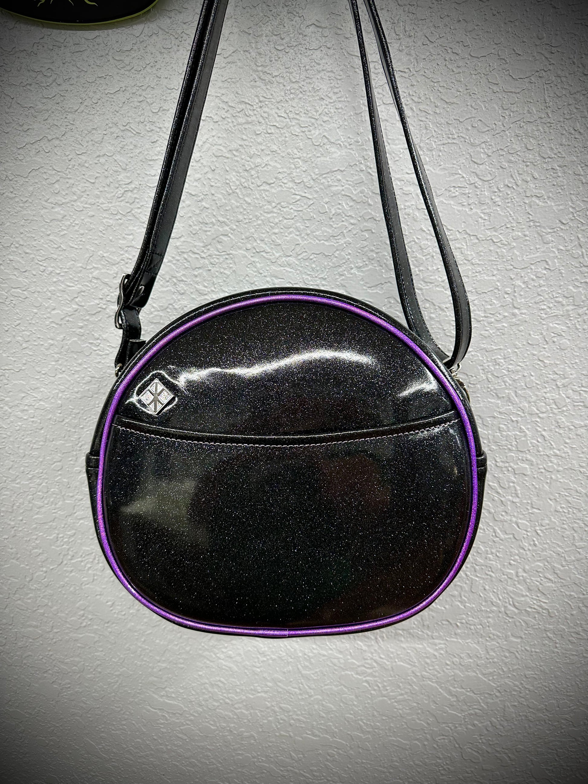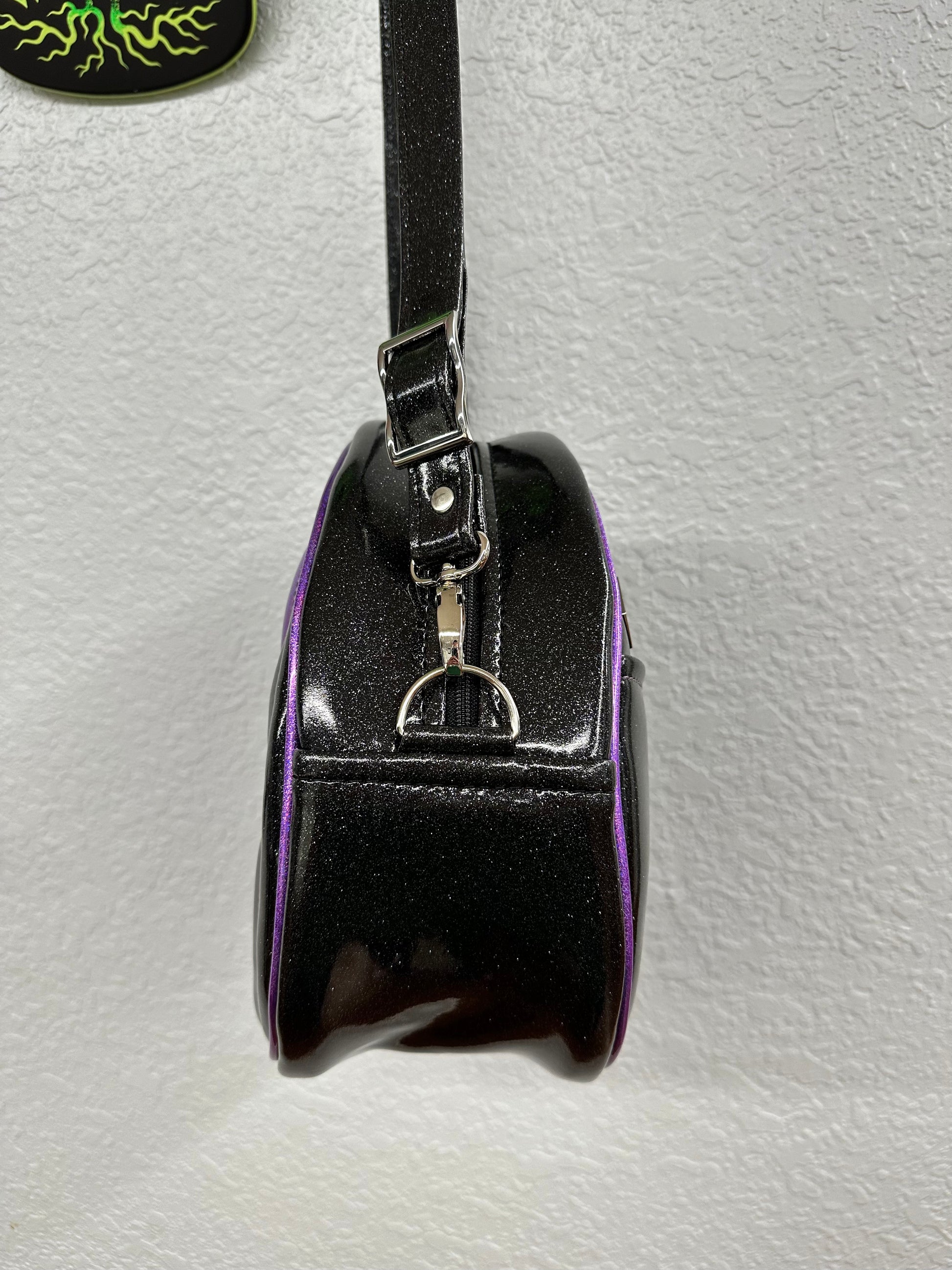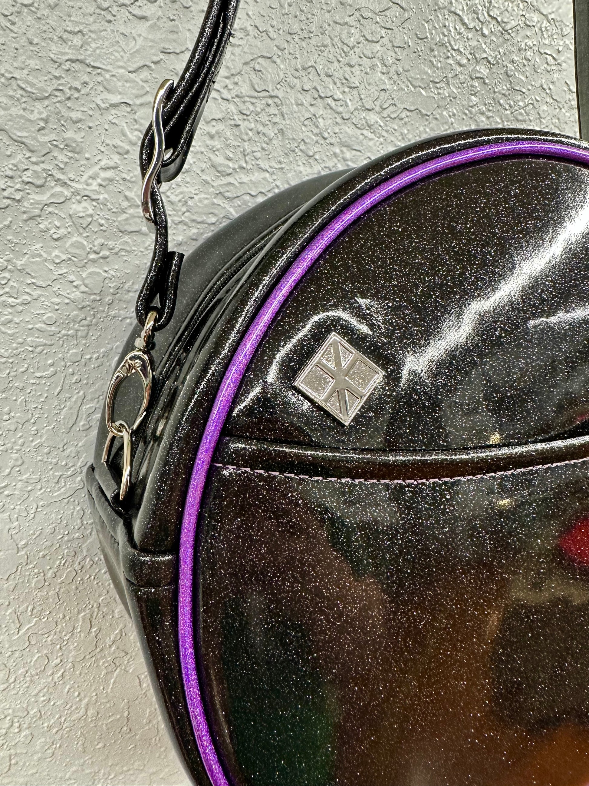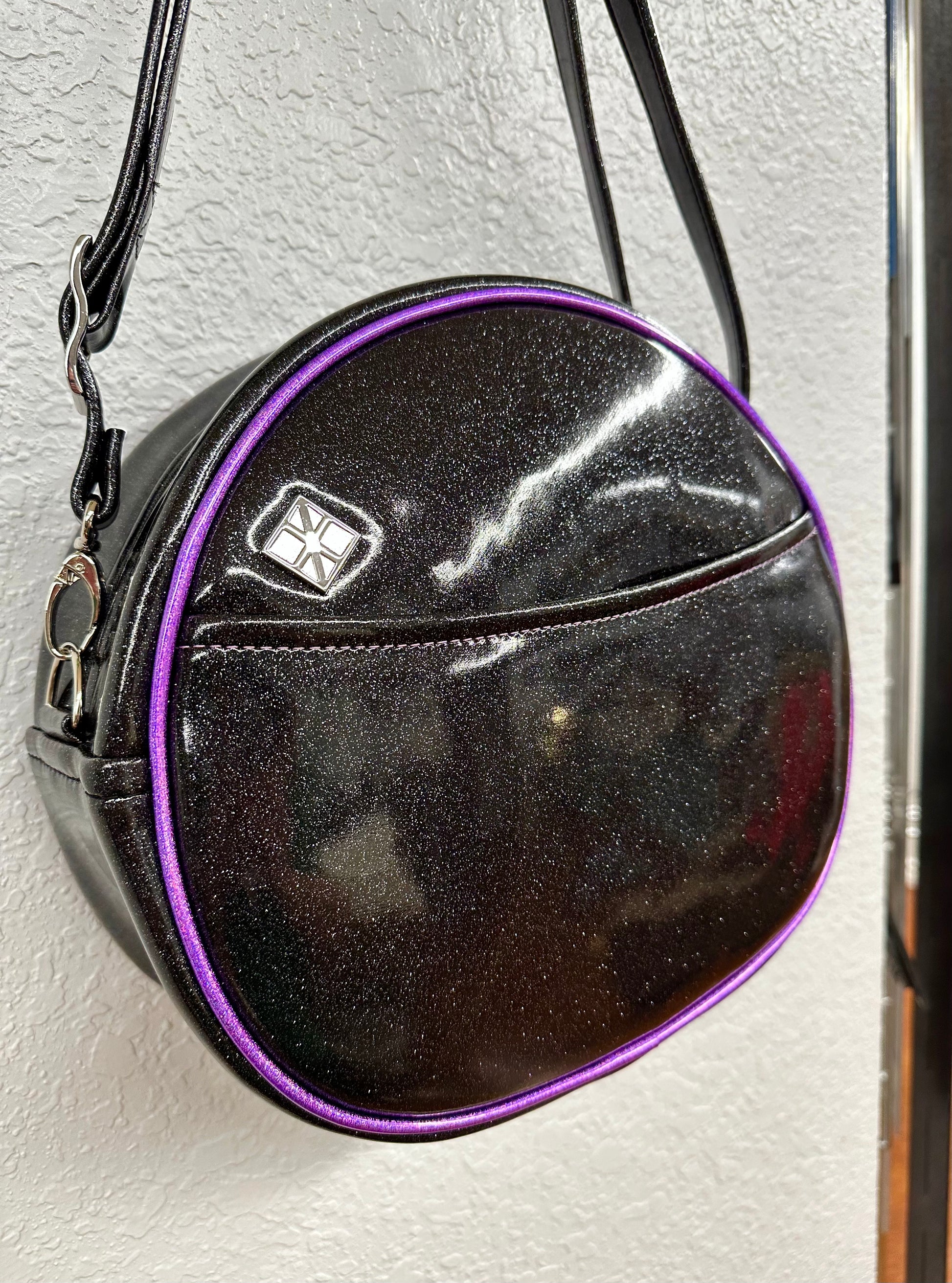 This Cruiser is finished in black glitter vinyl paired lavender holo glitter vinyl. We used a matching lavender thread to complement the piping and face. This one comes with our adjustable crossbody strap in black glitter vinyl. It has one outside slip pocket and two inside slip pockets. The bag is lined in a black padded nylon fabric.