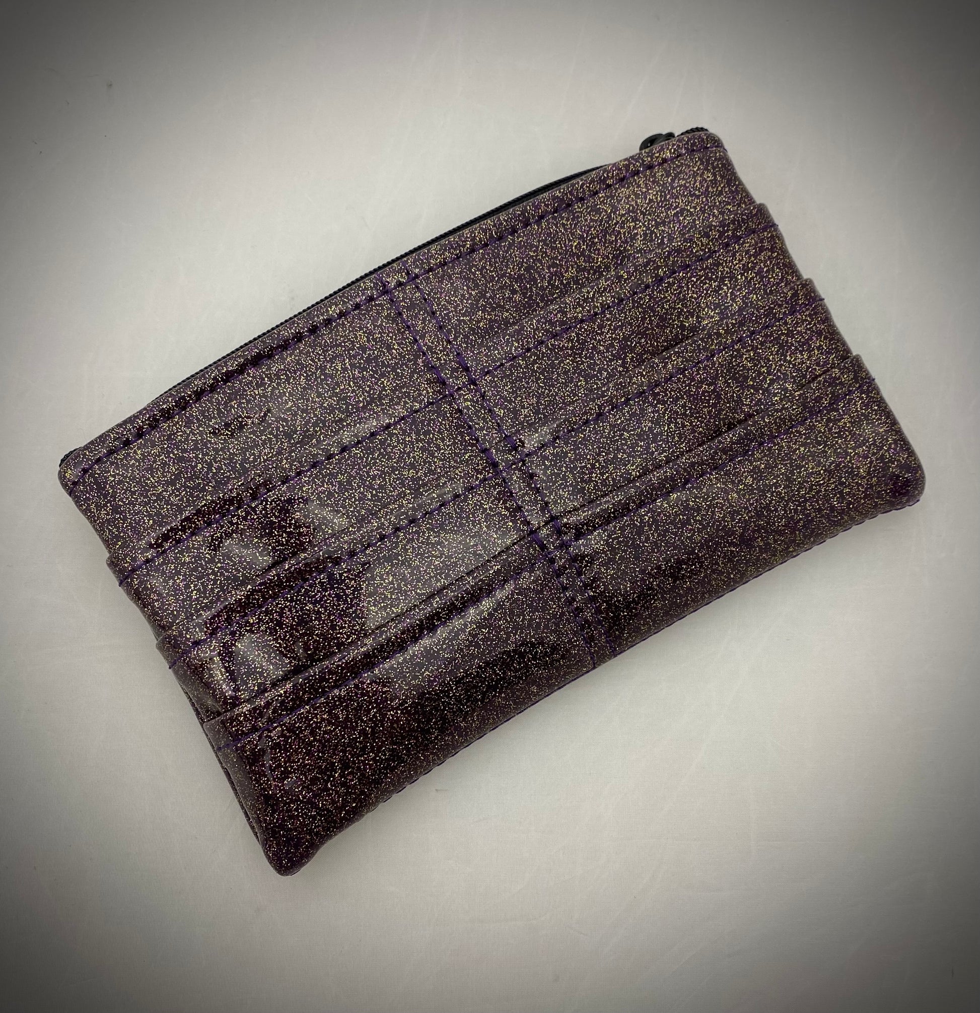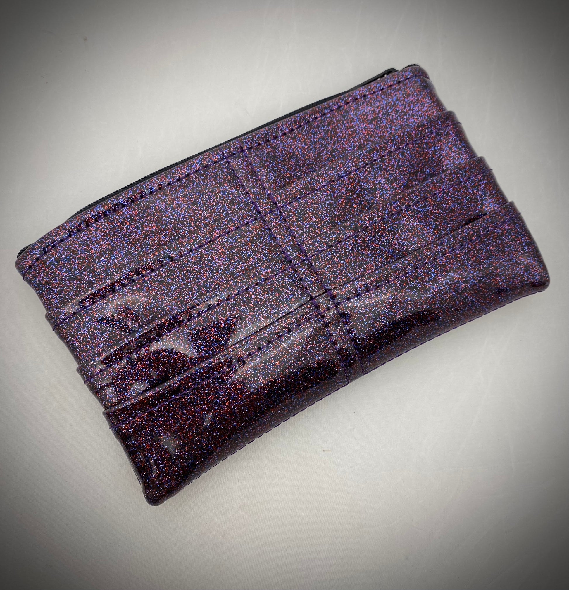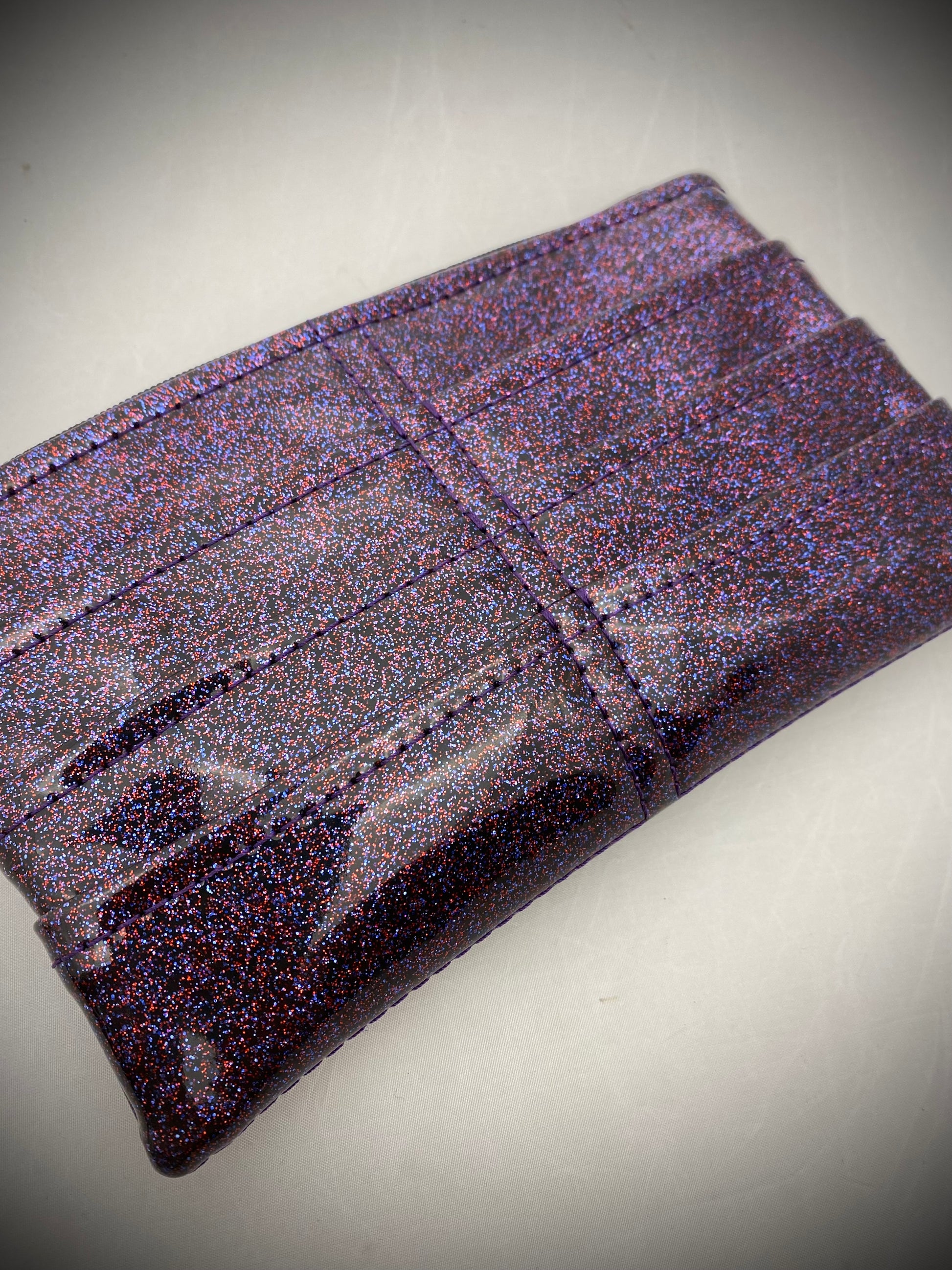 These measure 8.5”x5”. They each have 6 card slots, a rear slip pocket that fits a checkbook/cell phone and a center, zipper area. These are great for stashing store loyalty cards! They are finished in high quality vinyl and lined in a padded black foam.