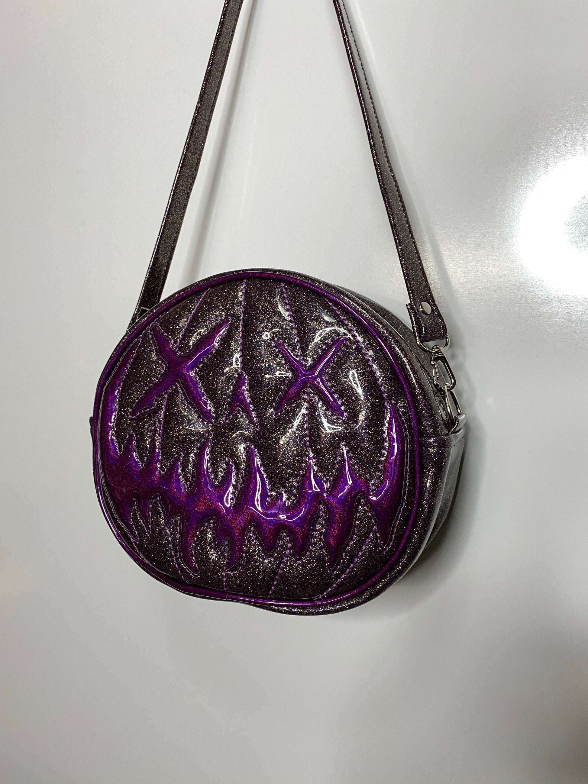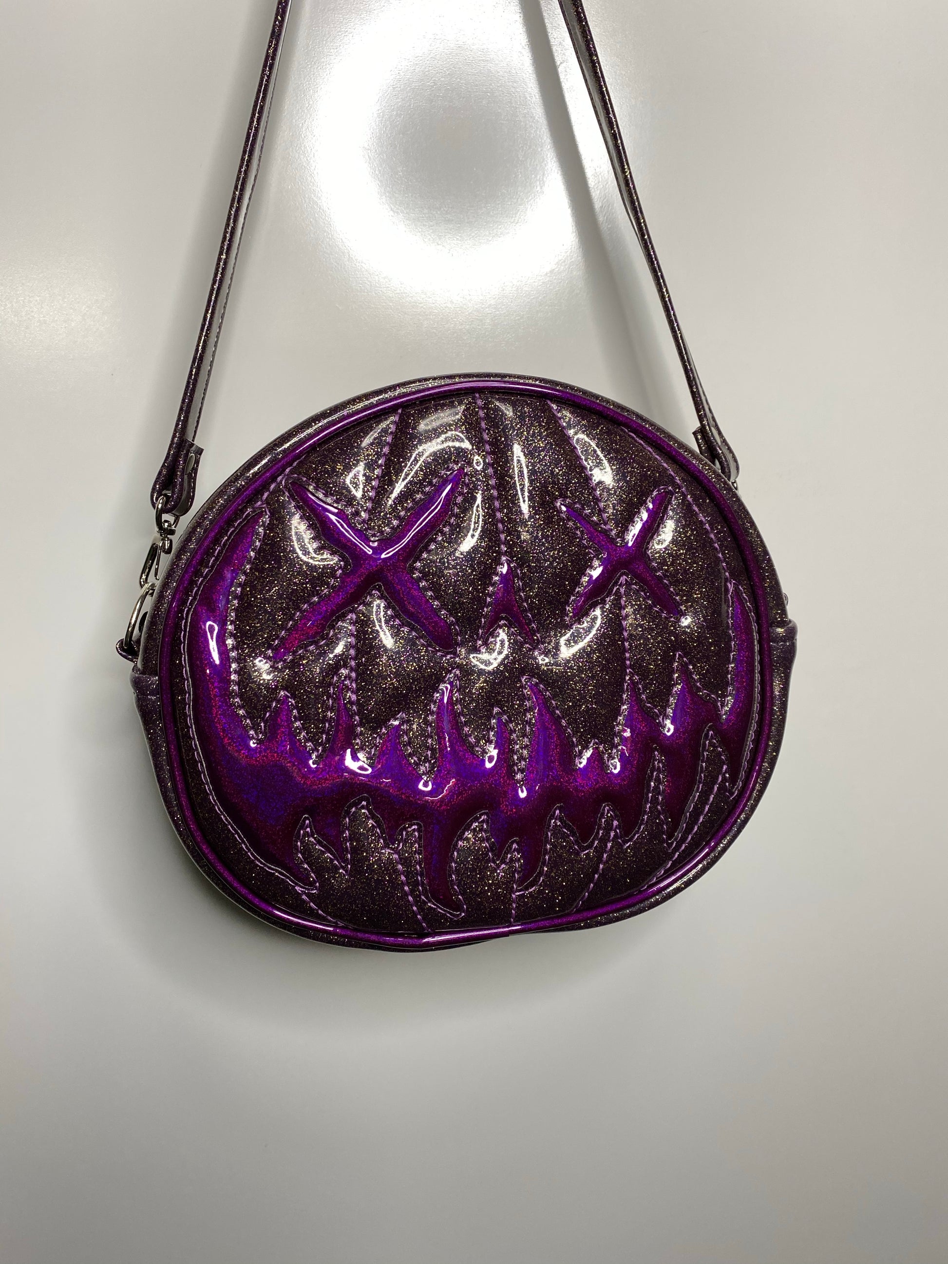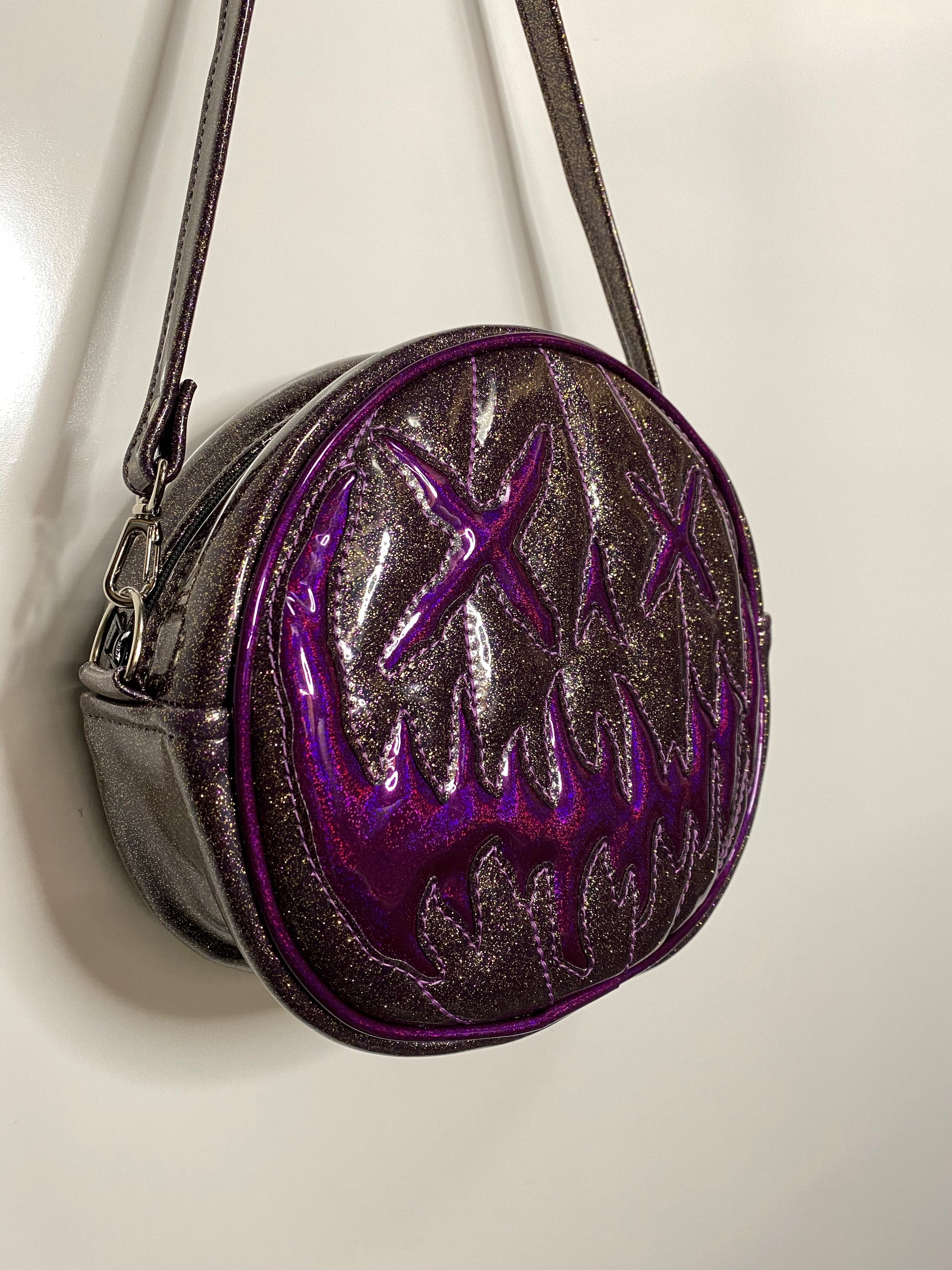 This handbag is finished in golden purple glitter vinyl and plum holo glitter vinyl. It features a coordinating, purple thread. This comes with a matching shoulder strap. It has one outside slip pocket and one inside slip pockets. The bag is lined in a black, padded nylon fabric.